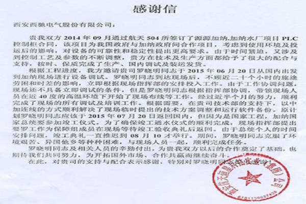 西安西馳電氣股份有限公司:貴我雙方2014年9月通過航天504所簽訂了源源加納.加納水廠項目PLC控制柜合同,該項目為我國政府與加納政府間合作項目,考慮到使用環境及投運后的影響,對...